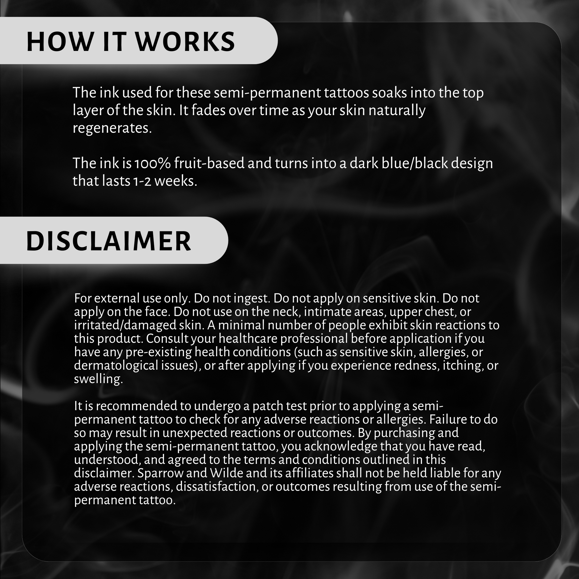 It is recommended to undergo a patch test prior to applying a semi-permanent tattoo to check for any adverse reactions or allergies. Failure to do so may result in unexpected reactions or outcomes. By purchasing and applying the semi-permanent tattoo, you acknowledge that you have read, understood, and agreed to the terms and conditions outlined in this disclaimer. Sparrow and Wilde and its affiliates shall not be held liable for any adverse reactions, dissatisfaction, or outcomes resulting from use of the semi-permanent tattoo.